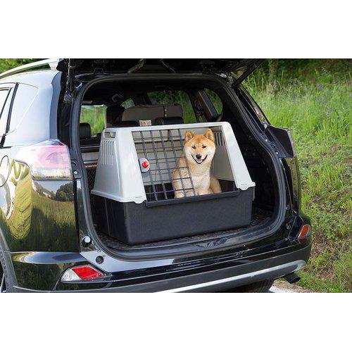 Største modell (100 x 80 x 71 cm) inkluderer skillevegg for to hunder og oppbevaringsrom på toppen for utstyr.