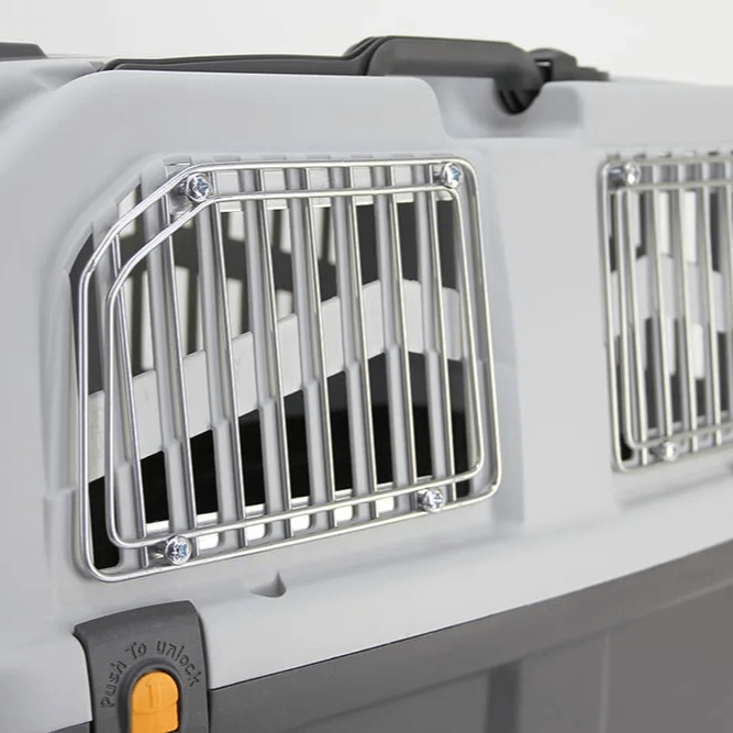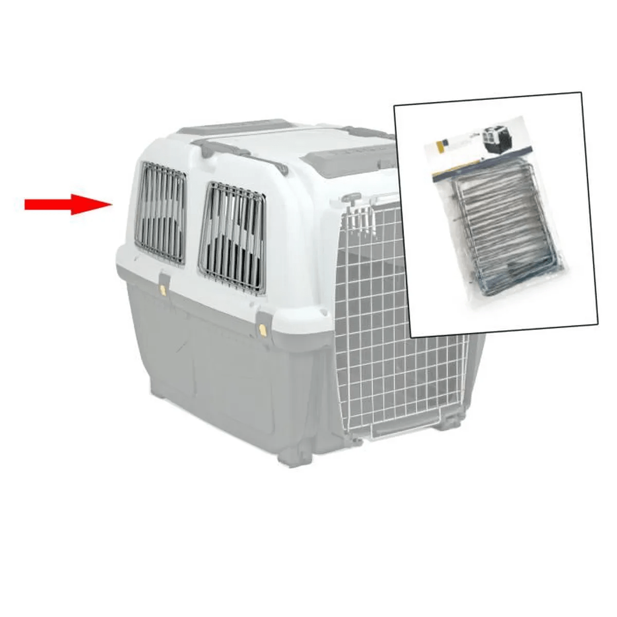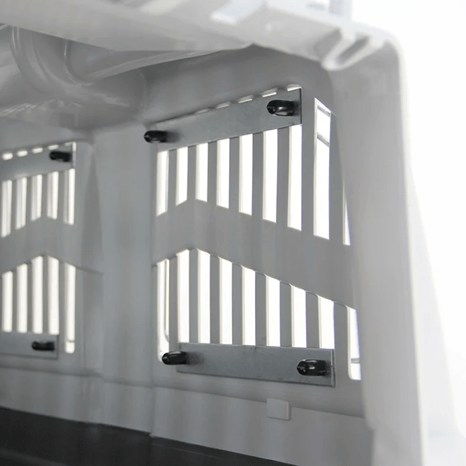 Ekstra sikkerhet for dyrets flytur! Forsterk plastspaltevinduene til transportkassen med disse valgfrie metall-lamellene. Enkel og rask å installere.
