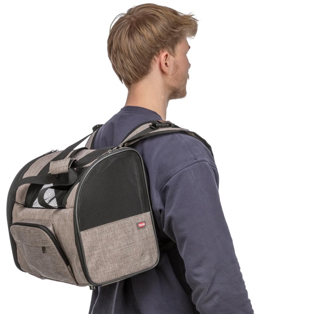 Trixie Shiva kan også brukes som veske hvis det blir nødvendig. Den har lommer for lagring, netting som gir utsyn og luft og et kort bånd på innsiden for å sikre kjæledyret. Åpning finner du i fronten og siden. Den er ekstra godt polstret.
