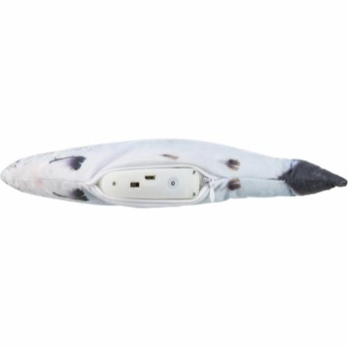 Sprellende Fisk katteleke – interaktiv og USB-oppladbar leke som beveger seg uregelmessig for å aktivere kattens jaktinstinkt. Laget av myk plysj og plast, med innebygd bjelle.